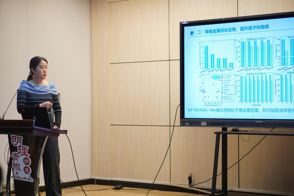李红作“镍基加氢催化剂的创新与应用”报告,介绍了具有不同孔结构的纳米多孔镍基催化剂的制备与其成型技术,探讨了这些催化剂在精细化学品合成中用于选择性加氢反应的应用。