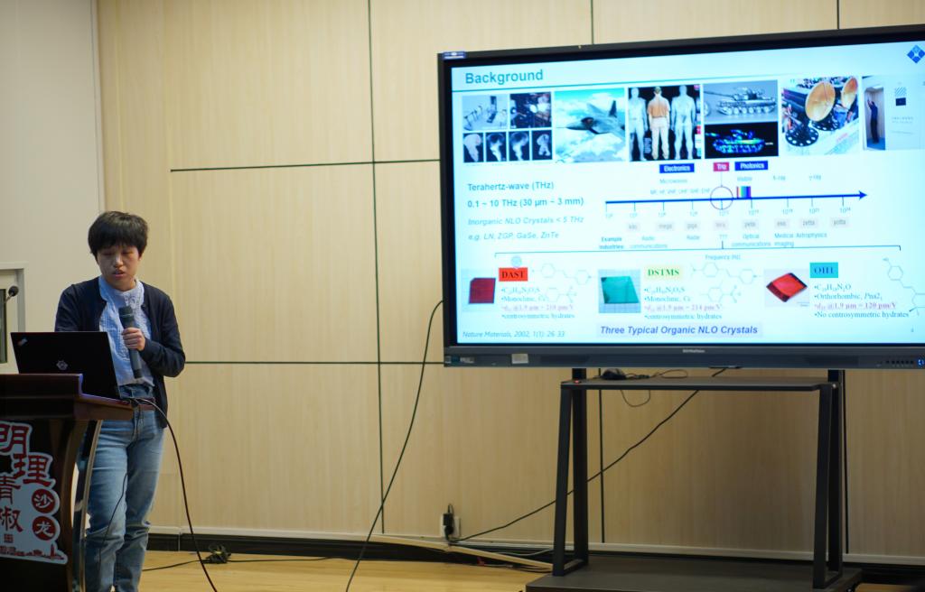 张馨元作“可用于太赫兹波产生和探测的吲哚基非线性光学晶体材料探索”报告,分析了此类晶体的组成结构设计策略。该研究通过一系列表征与性能测试评估了其在太赫兹辐射产生与探测领域的应用前景。