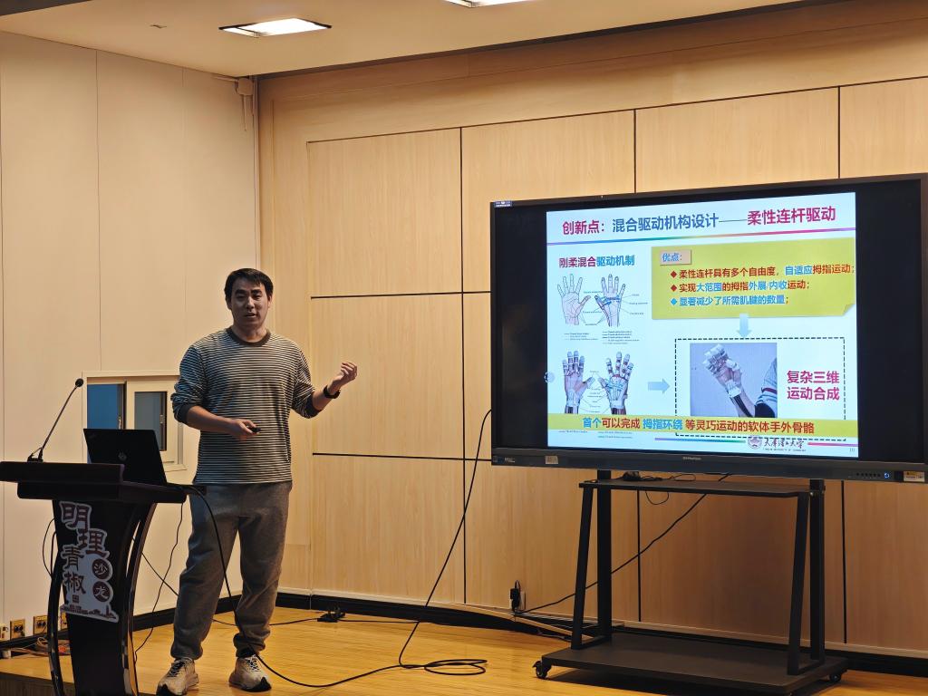 陈文远作“手外骨骼机器人设计与控制”报告,系统探究了手外骨骼机器人的设计、意图识别与智能控制方法。该机器人通过对偏瘫患者的临床测试,验证了其在提升患者生活水平方面的有效性。