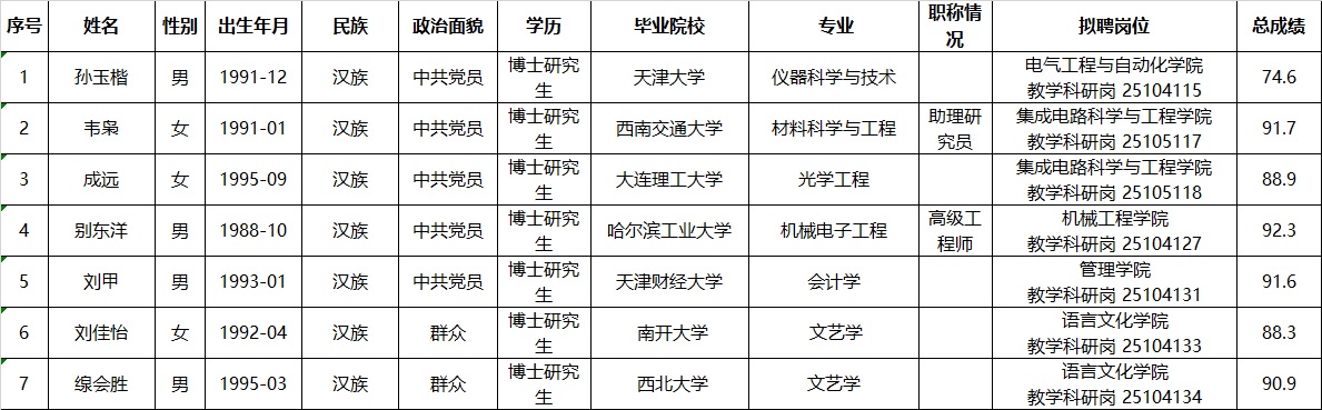 按照《天津市事业单位公开招聘人员实施办法(试行)》(津人社局发[2011]10号)要求,现将天津理工大学2025年度公开招聘方案(博士岗)部分岗位拟聘人员予以公示。